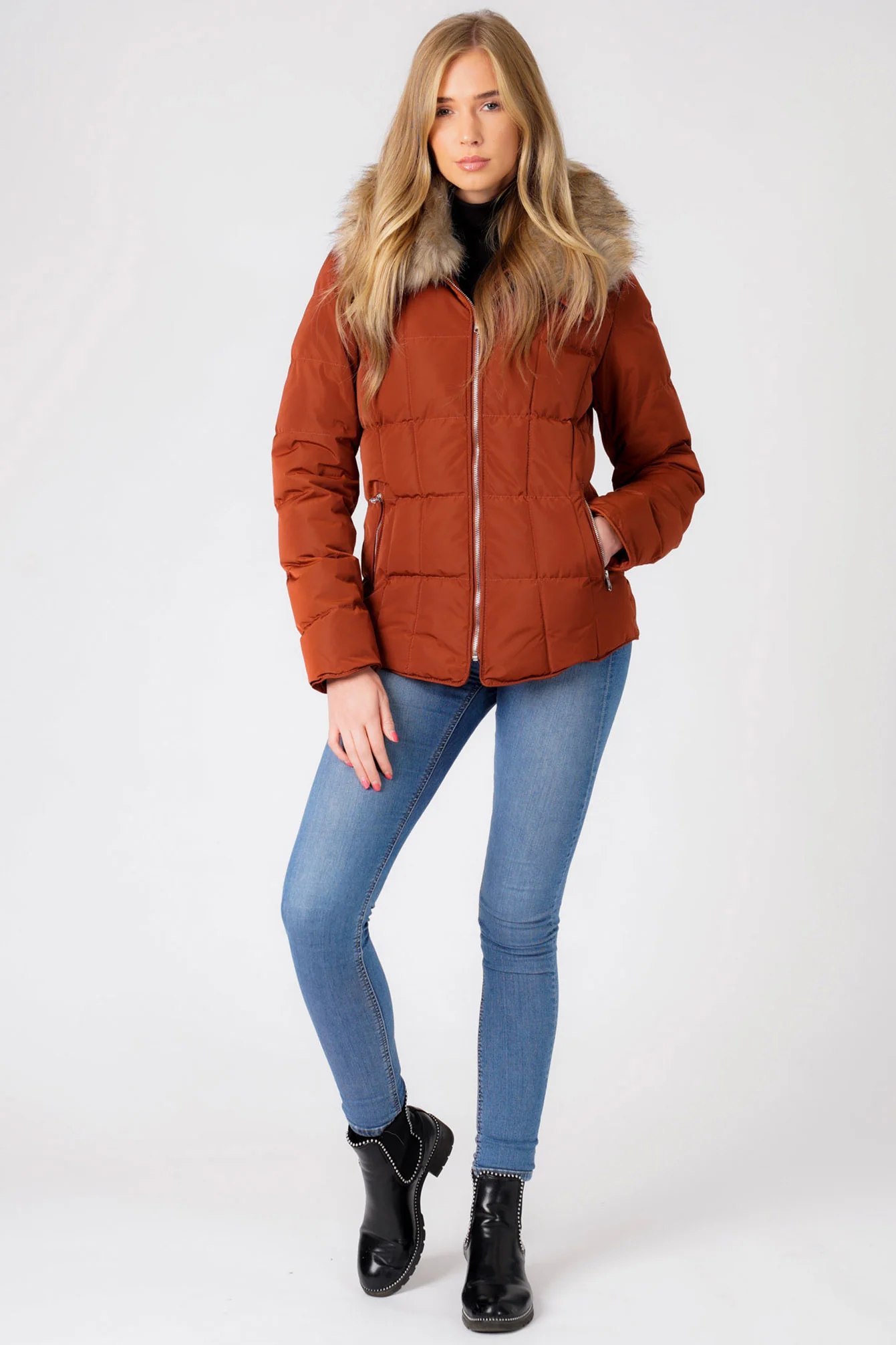 Add some new season style to your winter wardrobe with this cosy ‘Bertie’ funnel neck quilted puffer jacket with detachable fur trim in smoked paprika by Tokyo Laundry. Perfect for the colder weather; it has the quilted design throughout, with soft poly padding for added insulation. The collar has a fully detachable faux fur collar that can be removed easily or kept on - keep it fully zipped up to keep your neck warm or wear down as a wide collar. With a full zip through fasten and two zip pockets, it's the ideal functional outerwear piece to keep you looking stylish but warm. Wear over a cable knit jumper dress and boots!